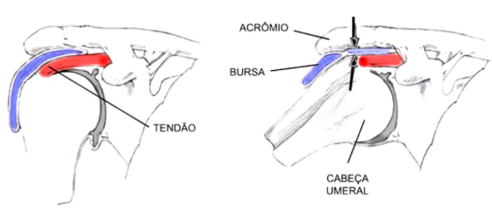 A inflamação dessas três estruturas (o tendão do supraespinhal, o tendão do infraespinhal e a bursa) ocorre devido ao atrito entre os dois ossos: o úmero e o acrômio. Esse “mastigamento” acontece quando esses ossos se encontram, comprimindo as estruturas que ficam entre eles.