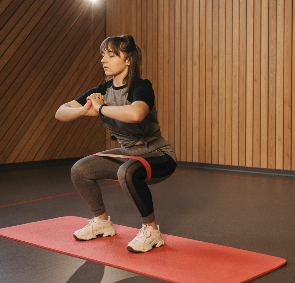 Se o problema for no quadril, que está posicionando os pés para dentro e está estressando a parte interna do joelho, é interessante fazer agachamentos usando um elástico em volta dos joelhos. Além disso, esse exercício vai fortalecer os rotadores externos de quadril para posicionar melhor o joelho, deixando-os mais alinhados com o movimento da corrida e do agachamento.