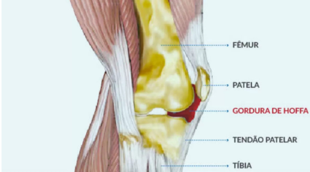 Observando de frente, pode-se notar duas “bolinhas” na lateral do tendão patelar. É a chamada gordura de Hoffa (ou hoffite se estiver inflamada), se estiver presente, pode ser um forte indício para o diagnóstico da tendinite patelar.