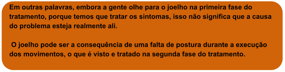 Na primeira fase, o foco do tratamento está voltado para o problema que o paciente tem no joelho e seus sintomas. Tratamos o edema, a inflamação, cuidamos da dor e do desconforto. Cessando a dor, ele é liberado para voltar às atividades do cotidiano.